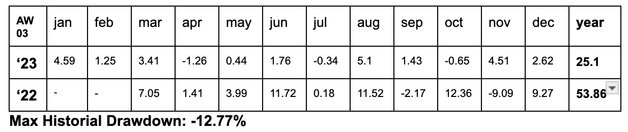 - AW03 (30% allocation): Also initiated in 2022, it has the same maximum risk levels as AW02 but with a maximum historical drawdown of 12.77% at the master level and 3.83% at the portfolio level.