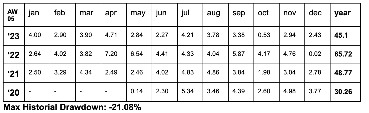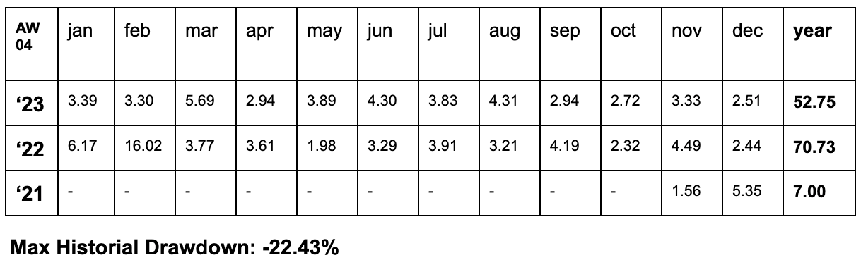 - AW05 (13.33% allocation): Initiated in 2020, it also assumes a maximum risk of 30% at the master level and 3.99% at the portfolio level, however, it has a maximum historical drawdown of 26.36% at the master level and 3.51% at the portfolio level.