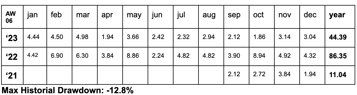 - AW06 (13.33% allocation): Launched in March 2022, it assumes a maximum risk of 30% at the master level and 3.99% at the portfolio level, with a maximum historical drawdown of 7.8% at the master level and 1.03% at the portfolio level.